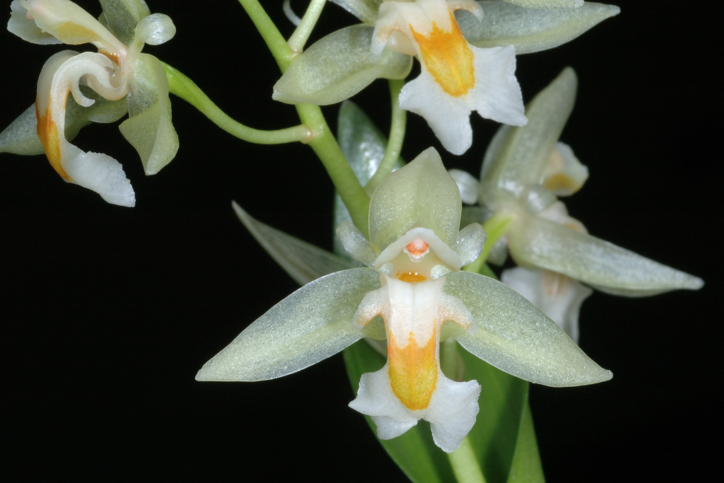 Found in pennisular Malaysia, Borneo, Sumatra, Java and the Philippines hill, lower montane moss, keranga, ridge oak/chestnut forests and subalpine shrubbery at elevations of 600 to 2700 meters as a medium sized, warm to cold growing epiphyte with swollen to slender pseudobulbs carrying 1 to 2 apical, narrowly lanceolate to obovate-lanceolate, acute, petiolate leaves that blooms in the spring on a erect, 8" [20 cm] long, several [7 to 15] flowered inflorescence with fragrant flowers arising out of a new pseudobulb growth.