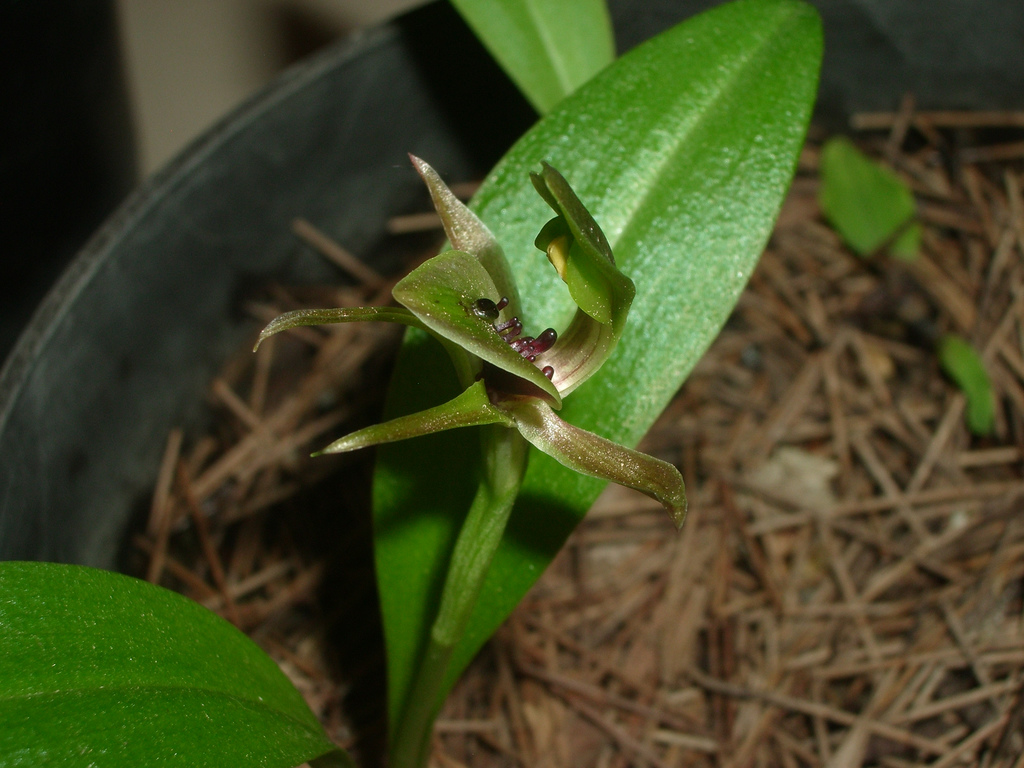 Found in New South Wales Australia in montane and subalpine, moist forests with grass, fern and bush understory at elevations of 900 to 1600 meters as a mini-miniature sized, cold growing terrestrial with 2 elliptic, obtuse. gradually narrowing below into the conduplicate petiolate base leaves that blooms in the spring and early summer on an erect, terminal, 3.2" [7.5 cm] long, single flowered inflorescence