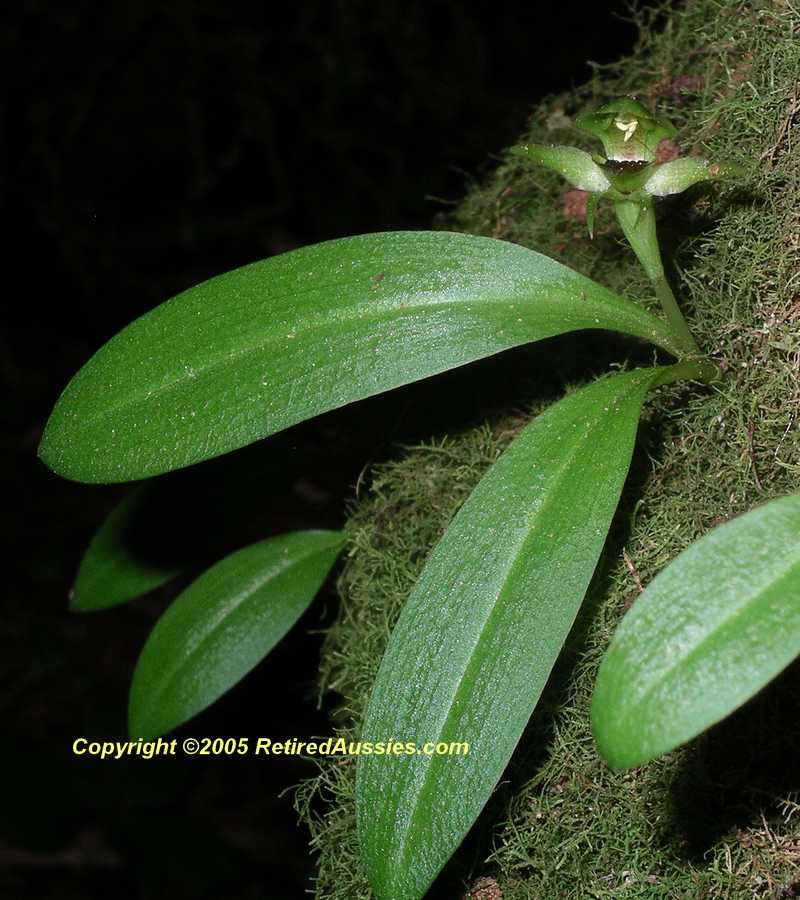 Found in New South Wales, Victoria, Tasmania and South Australia usually in mountain areas in closed, shady, wet forests at elevations of 50 to 2000 meters as a miniature sized, cold growing terrestrial small ground hugging plant with 2 parellel, veined, green, elliptic leaves that blooms in the spring and early summer on an erect, 1 3/5" [4 cm] long, single flowered inflorescence.