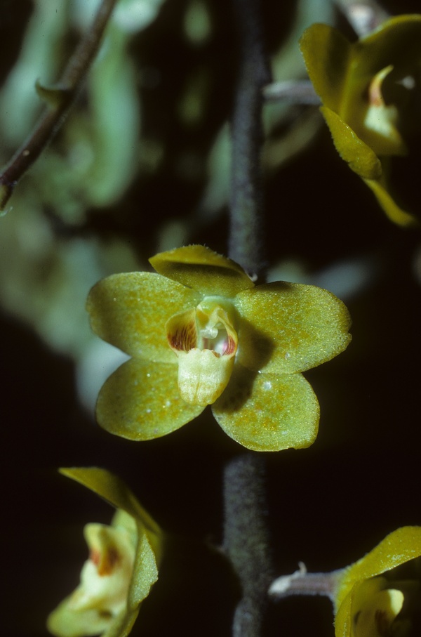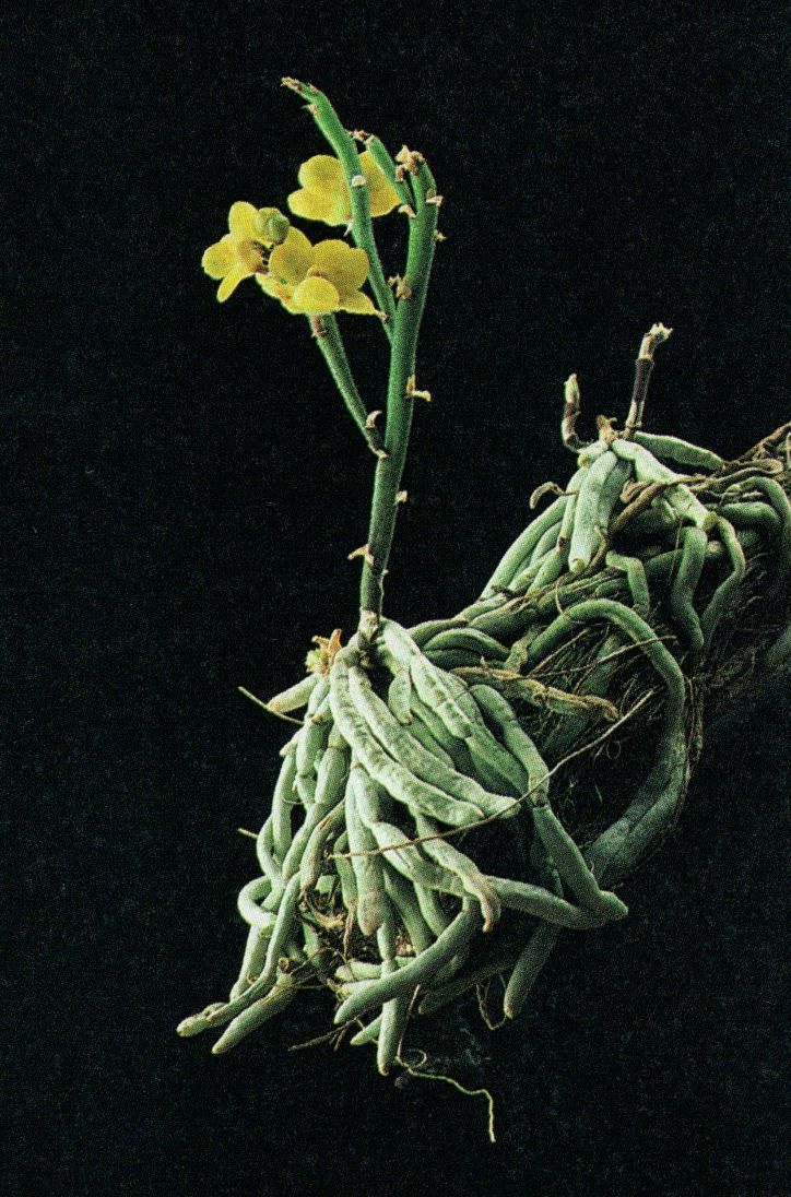 Found in Thailand and Vietnam in humid, mossy, mixed and coniferous forests on mossy branches of old, dwarf, gnarled trees at low to moderate elevations and has grey green roots that bloom with an erect, fleshy, 3 1/4 to 4" [8 to 10 cm] long, branched, few flowered inflorescence occuring in the spring.