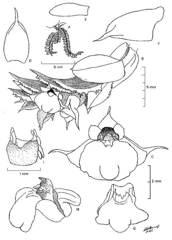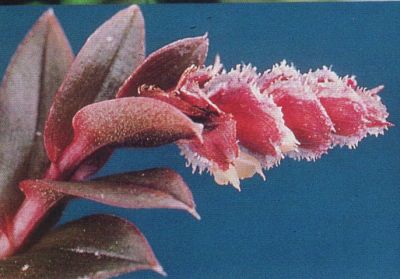Found in New Guinea, the Solomon Islands and the Bismark Archipelago in rainforests at elevations of 40 to 730 meters as a small sized, hot to warm growing epiphyte with a leafy stem carrying distichous, thin, light green, tinged purple towards the top of the stem, lanceolate, minutely acuminate apically, basally clasping leaves that blooms in the winter on a terminal, elongate, to 1.6" [to 4 cm] long, several to many flowered inflorescence with distichous, longer than the flowers, twisted to be all in one plane, serrate, purple with white margins, ovate, acuminate floral bracts