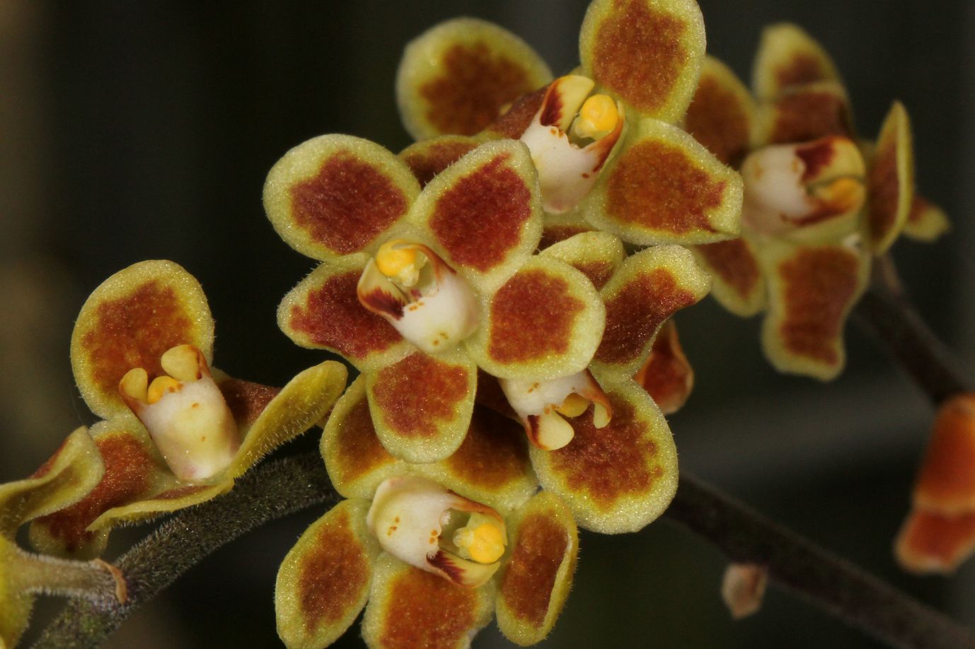Found in Thailand as a small sized, hot to warm growing epiphyte that blooms in the spring on a pendulous, many branched, to 13.2" [33 cm] long, many [22] flowered inflorescence that arises with two leaves present and carries fragrant flowers