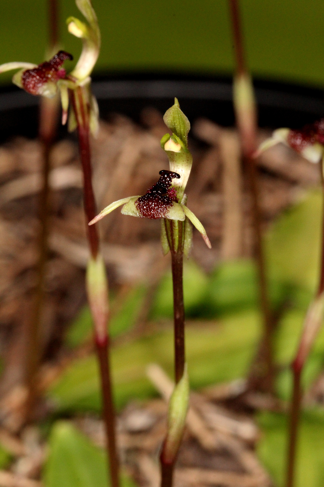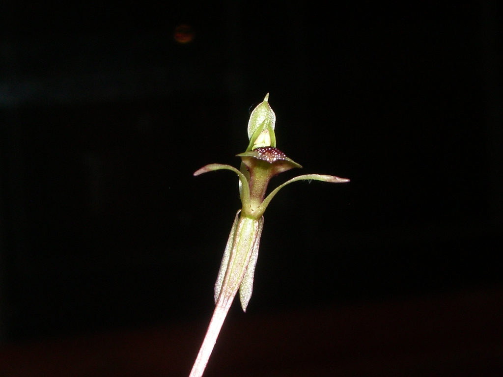 Found in Queensland Australia at elevations of 400 to 800 meters in shelter of large sandstone boulders in sparse open forests as a miniature sized, cold growing terrestrial with elliptic leaves that blooms in the winter on an erect, 2 to 3" [5 to 7.5 cm] long, single flowered inflorescence