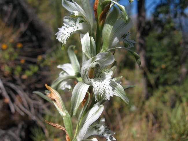 Found in Patagonia Argentina in forest margins where this plant was photographed in situ as a large sized, cold growing terrestrial with basal, lanceolate, intense green leaves that blooms in the late spring and early summer on a terminal, erect, 3.2 to 8" [8 to 20 cm] long, 6 to 15 flowered inflorescence.