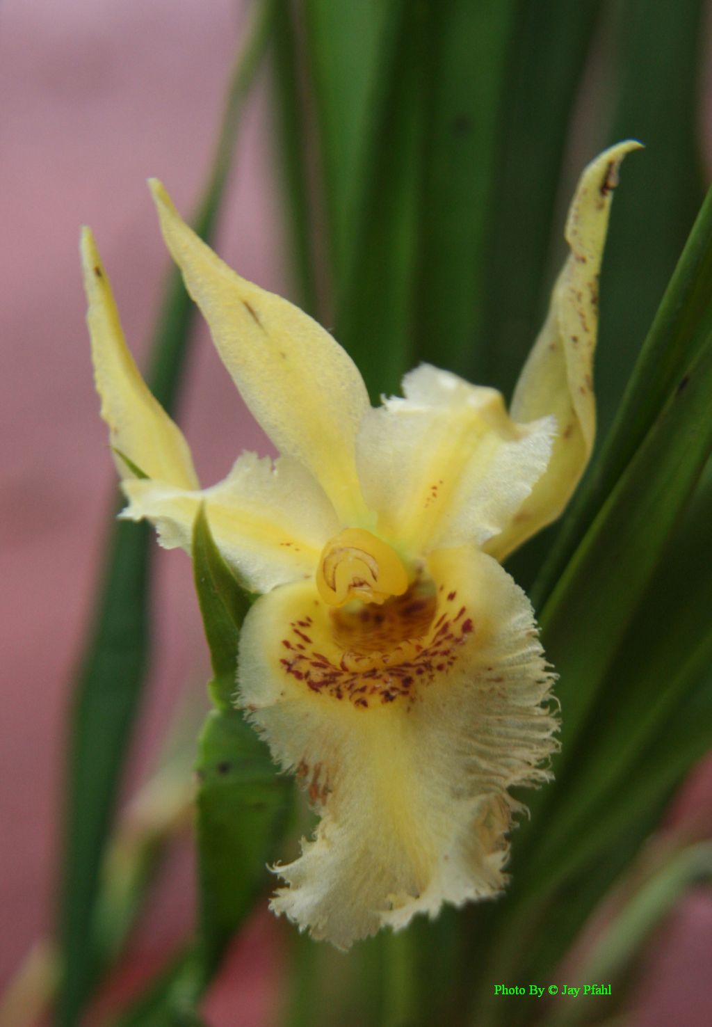 Newly found in Colombia and Ecuador at elevations of 1400 to 1600 meters as a small to medium sized, cool growing epiphyte with a few narrow leaves that blooms on and off throughout the year on a lateral, 4" [10 cm] long, single flowered inflorescence.