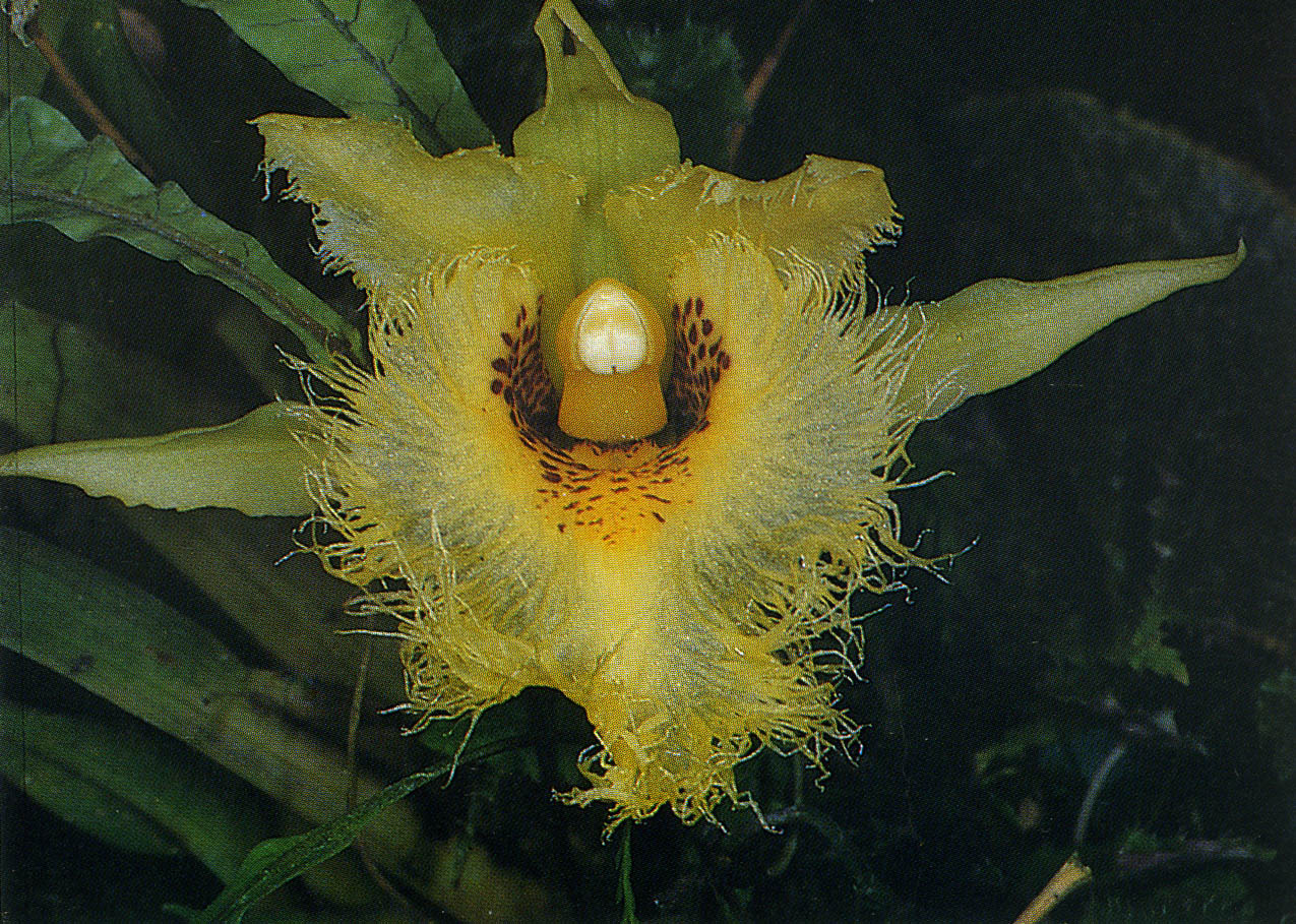 Found in Esmeraldas Ecuador at elevations around 600 to 1450 meters as a medium sized, warm to cool growing epiphyte with a loose fan of several, oblong, acute leaves that blooms on an axillary, [14 cm] long, several bracted, single flowered inflorescence holding the flower at mid leaf.
