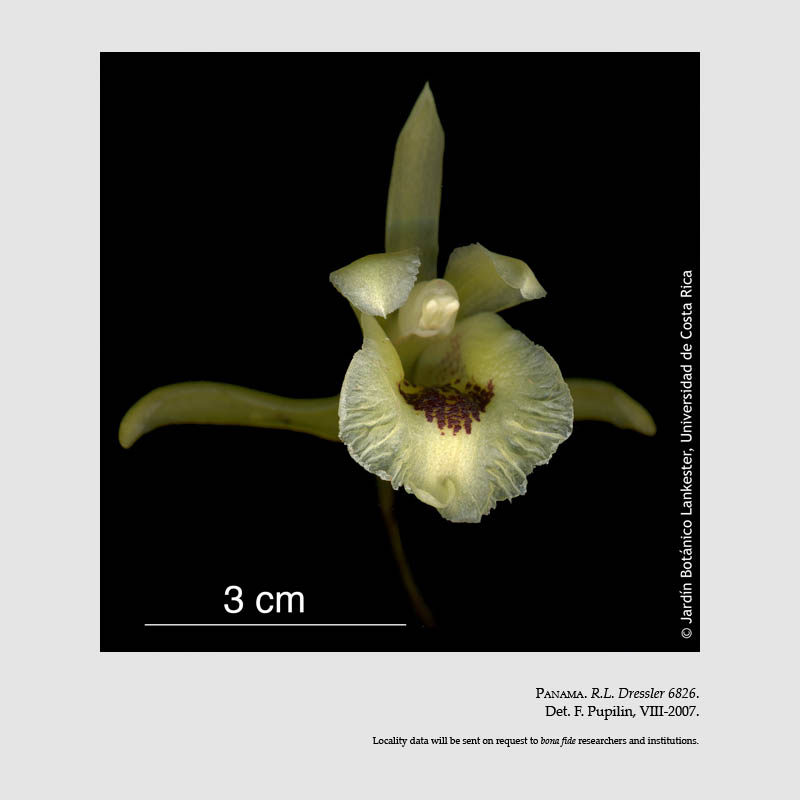 Found in Panama in cloud forests on the Pacific slopes at elevations around 800 to 1000 meters as a small to medium sized, warm growing epiphyte without pseduobulbs and carrying 3 to 4, narrowly oblanceolate, acuminate, acute, conduplicate below leaves that blooms in the late spring and early summer on a basal, 2" [5 cm] long, single flowered inflorescence occuring