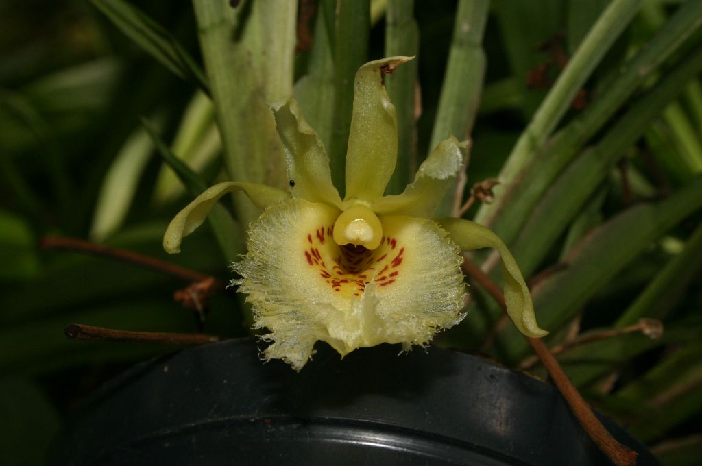 Found from Colombia, Ecuador and Peru in extremely wet montane forests at elevations of 950 to 2000 meters as a small to medium sized, warm to cool growing epiphyte without pseudobulbs and a distichous fan of strap-shaped, acute to acuminate leaves that blooms at most any time of the year on an axillary, 4" [10 cm] single flowered inflorescence.