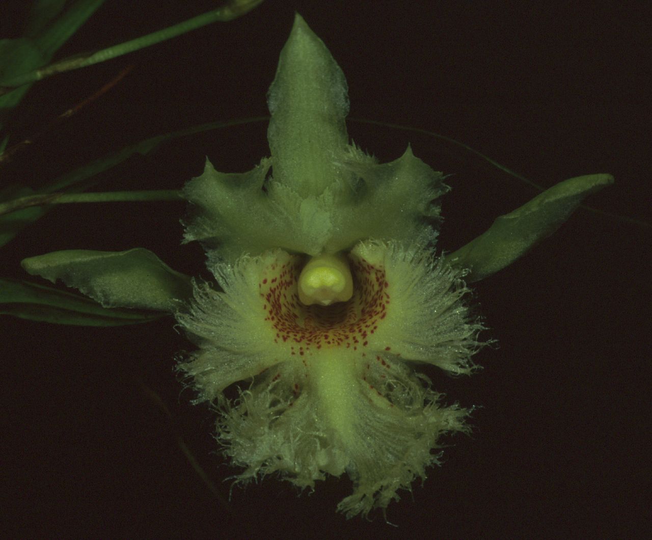 Found in Colombia, Ecuador and Peru in extremely wet montane forests at elevations of 900 to 1650 meters as a small sized, warm to cool growing epiphyte with distichous, arranged in a fan-shape, dark green, narrowly linear, becoming conduplicate towards the base leaves that blooms at most any time of the year on an axillary, from near the base, single flowered, 4" [10 cm] long inflorescence carrying fragrant flowers.