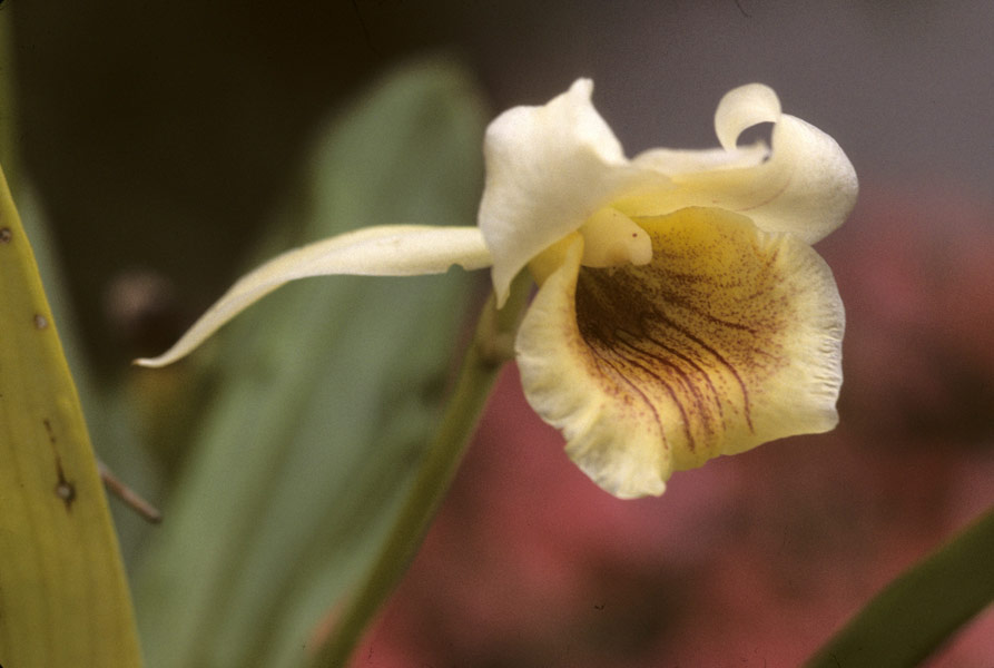 Found in Nicaragua in wet montane cloud forests at elevations of 400 to 1500 meters as a small sized, hot to cool growing epiphyte with a short stem enveloped completely by several imbricating sheaths with the uppermost few being foliaceous with elliptical, acute leaves that gradually narrow into a conduplicate petiole and blooms in the spring on 3 to 4, basal, erect, 3 3/5" [9 cm] long, single flowered inflorescence enveloped by 2 to 3 elongate, tubular, acuminate sheaths holding the flower at mid leaf. This species differs from the other more common Central American species C lendyana by it's larger flower, creamy yellow color instead of bright chrome yellow, and red-violet stripes as well as the much more erect and broad leafed plant.