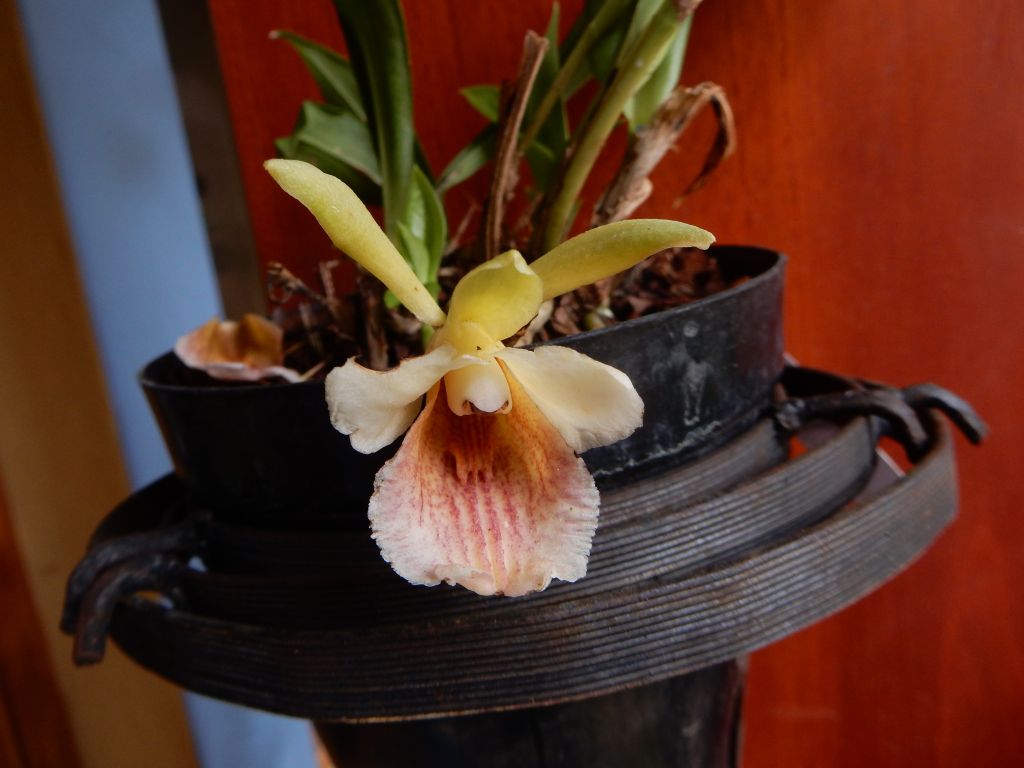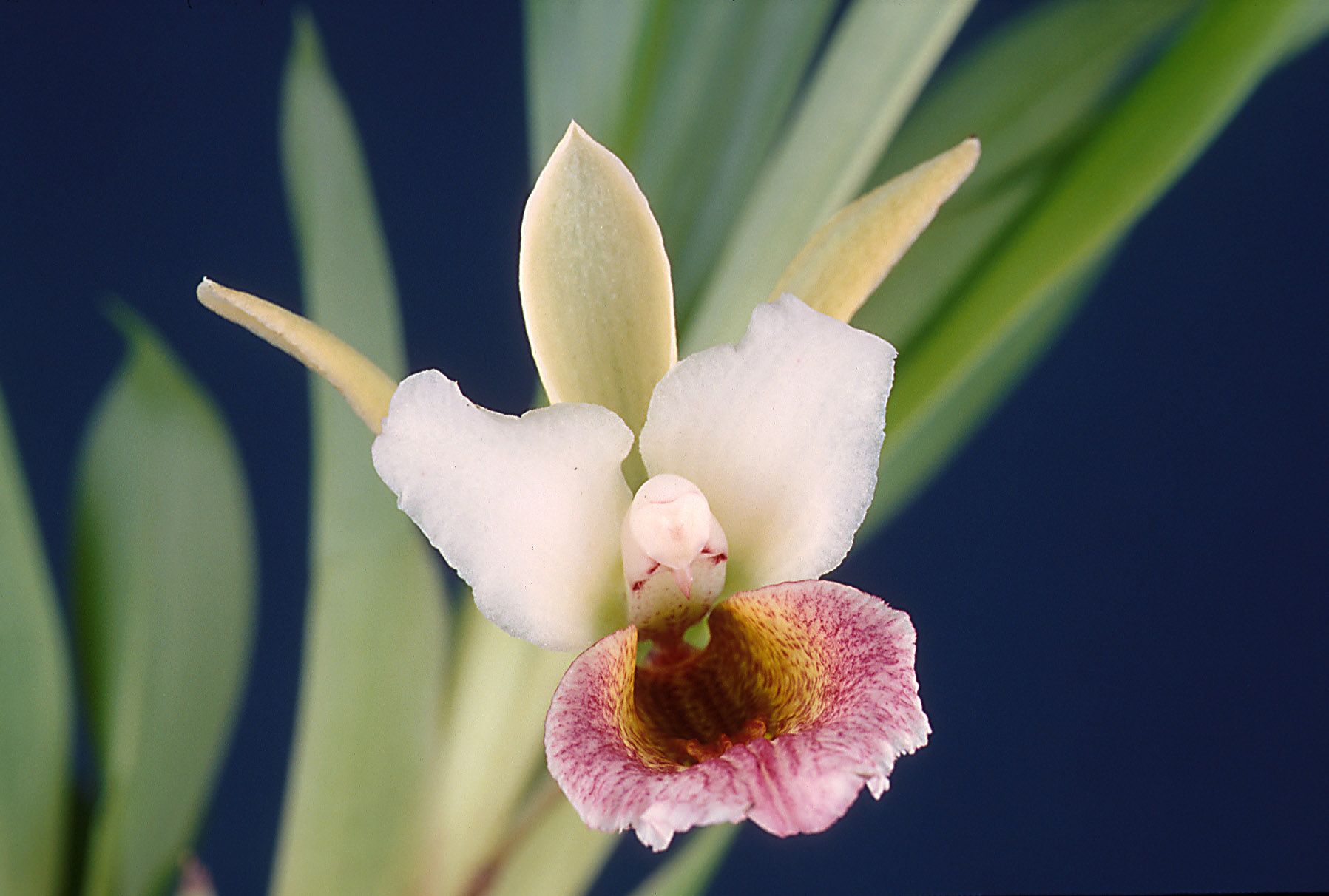 Found in Colombia at elevations around 1800 meters as a small to medium sized, cool growing epiphyte with oblanceolate, acute, prominently veined beneath leaves that blooms in the summer on a 2.4 to 4" [6 to 10 cm] long, 2 bracted, single flowered inflorescence with paired floral bracts.