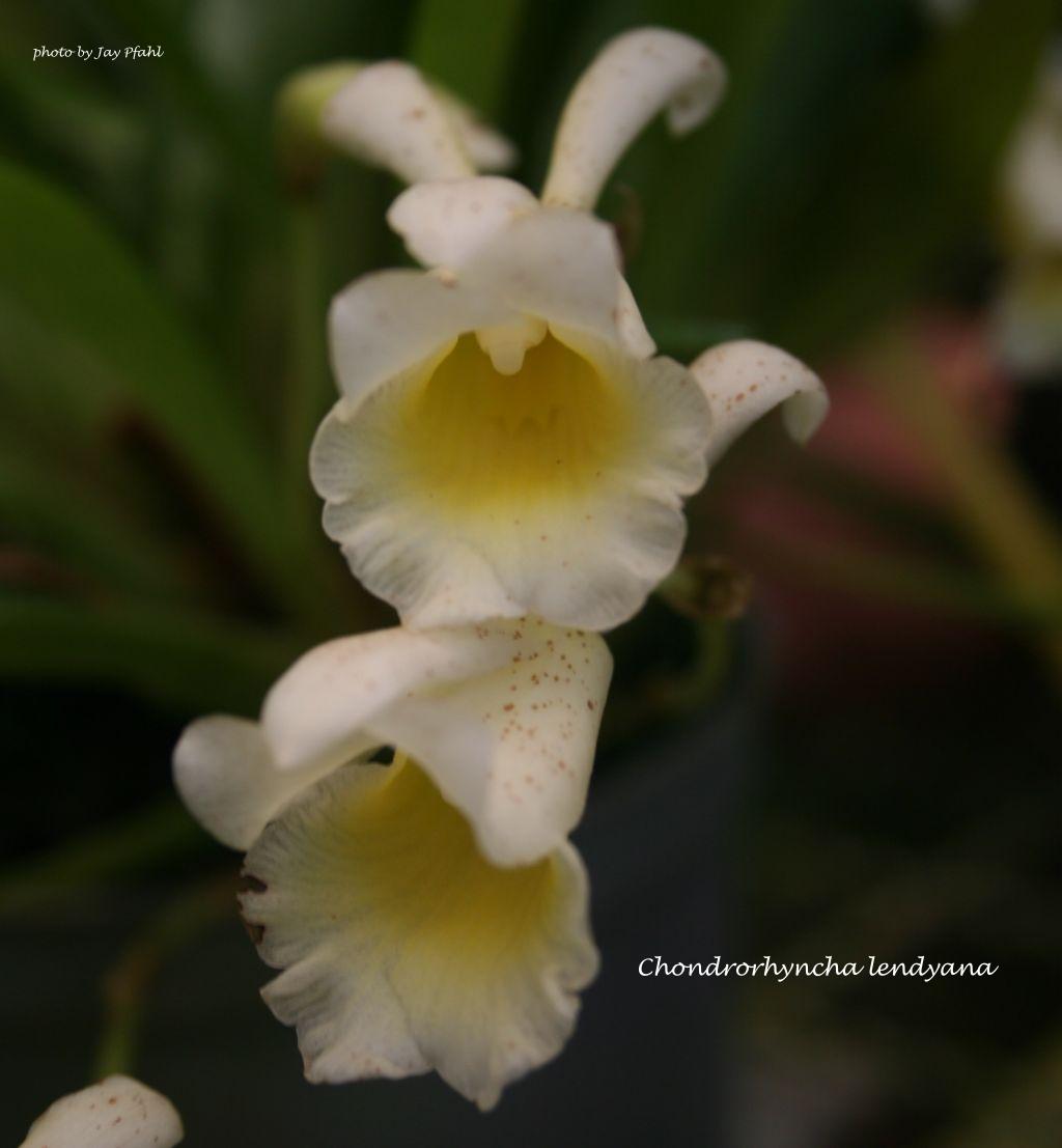 References W3 Tropicos, Kew Monocot list , IPNI ; Die Orchideen Schlechter 1915 as Chondrorhyncha lendyana; AOS Bulletin Vol 28 No 4 1959 as Chondrorhyncha lendyana photo not = Chondroscaphe atrilinguis; Las Orquedias de El Salvador Vol 3 Hamer 1981 drawing/photo fide; Encyclopedia of Cultivated Orchids Hawkes 1987 as Chondrorhyncha lendyana; Miniature Orchids Northen 1983; Orchids of Guatemala and Belize Ames & Correll 1985; Selbyana Vol 10 Orchids of Central America Hamer 1988 as Chondrorhyncha lendyana drawing fide; Rudolf Schlechter Die Orchideen Band 1B lieferung 26 1584 - 1648 Brieger 1992 as Chondrorhyncha lendyana photo ok; Field Guide to the Orchids of Costa Rica and Panama Dressler 1993; Orchid Digest Vol 58 No 2 1994; Manual of Orchids Stewart 1995; Icones Planetarum Tropicarum Plate 704 Hamer 1982 as Chondrorhyncha lendyana drawing fide; Guatemala Y Sus Orquideas Behar & Tinschert 1998 photo fide; Orquideologia Vol 21 #3 2000 as Chondrorhyncha lendyana photo fide; Vanishing Beauty, Native Costa Rican Orchids Vol 1 Pupulin 2005 as Chondrorhyncha lendyana photo fide; Icones Orchidacearum fascile 10 plate 1099 Hagsater & Soto 2008 drawing fide; Huntleyas and Related Orchids Harding 2008 photo fide; AOS Bulletin Vol 78 #6 2009 photo fide; Guia de Orquideas de Chiapas Carlos Rommel Beutelspacher Baigts 2013 photo fide; Algunas Orquideas de Mexico Tomo 1 Suarez 2013 as Chondrorhyncha lendyana photo fide; Orchids of Tropical America an introduction and guide Meisel 2014 photos fide; Orchids, A Colombian Treasure Vol 1 Ortiz & Uribe 2014 photo fide; AOS Bulletin Vol 86 #6 2017 photo fide; Orchid Genera and Species in Guatemala Archila, Szlachchetko, Chiron, Lipinska, Mystkowska and Bertolini 2018 photo fide
