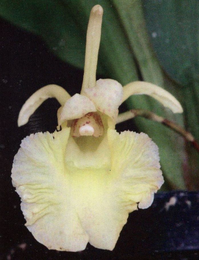 Found in Morona-Santiago department of Ecuador in wet montane forests at elevations around 1500 to 1850 meters as a medium sized, cool growing epiphyte with a loose fan of several, strap-shaped, widest in the middle, conduplicate leaves that blooms on an axillary, 3.2 to 4" [8 to 10 cm] long, 1 to 2, ovoid bracted, single flowered inflorescence.