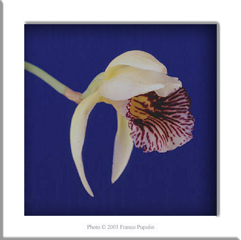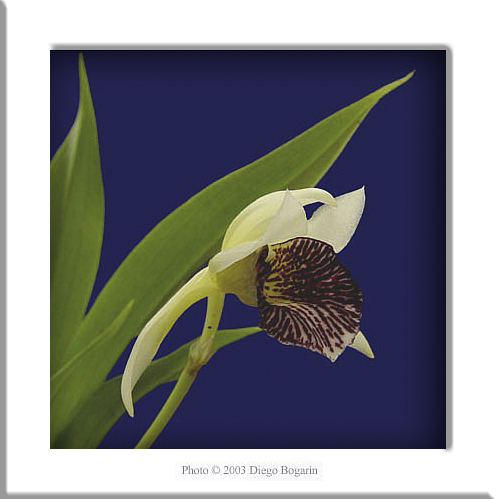 Found only in Costa Rica in moist cloud forests on shady tree trunks at elevations of 1400 to 2500 meters as a small sized, cool to cold growing epiphyte with articulate, arranged in a fan, narrowly oblanceolate, attenuate leaves that blooms in the spring on an axillary, 3.4 to 4" [8.5 to 10 cm] long, single flowered inflorescence.
