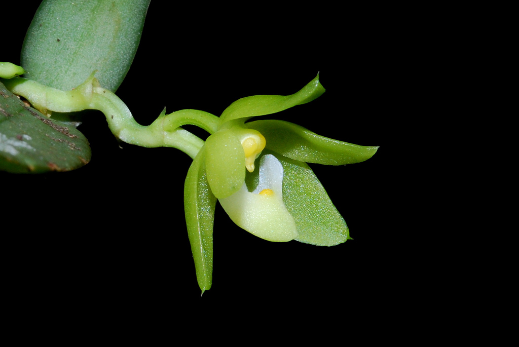 Found in Thailand, Borneo, Malaysia and Sumatra in hill forests at elevations of [100] 500 to 1000 meters as a mini-miniature sized, warm growing epiphyte with a stout, erect stem carrying spreading, thickly fleshy, basally narrowed, narrowly strap-shaped, unequally and acutely bilobed apically leaves that blooms through the summer on a flattened, 1" [2.5 cm] long, successively single to 8 flowered inflorescence with fleshy, broadly ovate, acuminate and apiculate floral bracts carrying very fragrant, short-lived, cupcake-smelling flowers.
