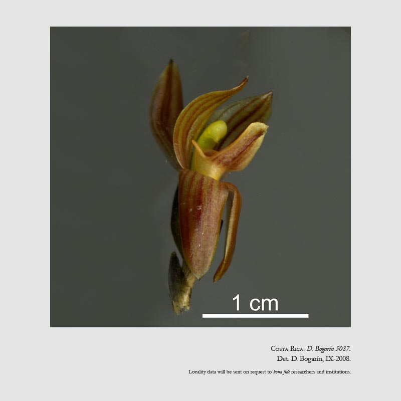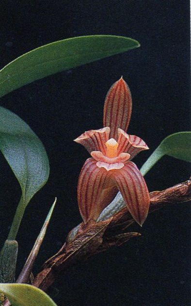 Found in Costa Rica and Panama in cloud forests in the crowns of trees at elevations of 1900 to 2000 meters as a small to medium sized, cool growing epiphyte with 1.6" to 2.8" [4 to 7 cm] between each cylindric pseudobulb partially enveloped below by a sheath and carrying a single apical, coriaceous, elliptic, keeled beneath, abruptly narrowing below into the petiolate base leaf that blooms in the summer on an arising from the rhizome, one per cataphyl, .6 to .8" [1.5 to 2 cm] long, single flowered inflorescence