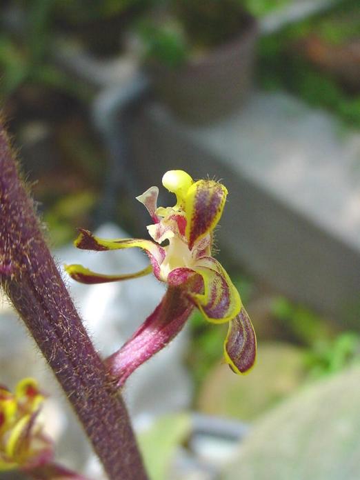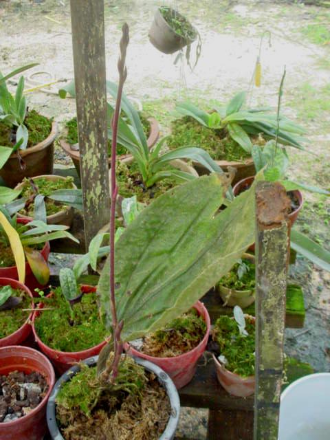 Found in Malaysia, Java, Borneo, the Philippines, Solomon Islands and New Guinea in lower montane forests on ridge tops often in exposed locations in humus at elevations of 600 to 2000 meters as a large sized, warm to cool growing terrestrial orchid with slightly quadrangular, apically tapering pseudobulbs carrying a single, brown, pubescent, plicate, ovate, acute leaf with a short hairy petiole that blooms in the winter on a terminal, 14 " [40 cm] tall, laxly many flowered, hairy, 28" [to 70 cm] long, dark purple inflorescence with lanceolate, acuminate to acute floral bracts and carrying non-resupinate flowers with only a few open at any one time.