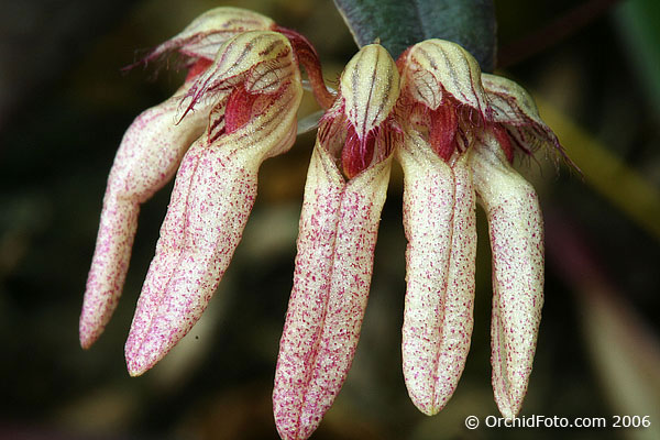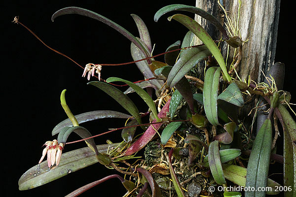 Found in Thailand, Malaysia, Borneo, Sumatra and the Philippines at elevations around 100 to 1200 meters found on mangrove trees as a hot to cool growing epiphyte with a creeping rhizome with 1/4 to 3/4" [1 to 2 cm] between each clustered ovoid, grooved, dark olive pseudobulb carrying a single, apical purplish leaf with a blunt apex and the base narrowing into a petiole that blooms in early spring, summer and fall on a solitary, lateral to erect, slender, basal, to 6" [15 cm] long, purplish, umbellate inflorescence drooping, shoe-shaped, fragrant flowers occuring .