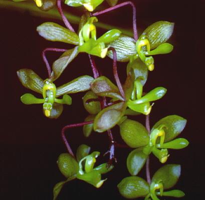 Found in Sao Paulo, Santa Catarina and Parana' states of Brazil as a medium sized, warm growing epiphyte with ovoid-oblong, clear green, glaucous, slightly tetragonal, becoming sulcate pseudobulbs enveloped in youth by pale sheaths and carrying a single, apical, plicate, 5 to 7 nerved, attenuate below into the petiolate base leaf that blooms in the late spring on several, racemose, limply pendant, 20" [50 cm] long, many flowered inflorescence carrying non-resupinate flowers.