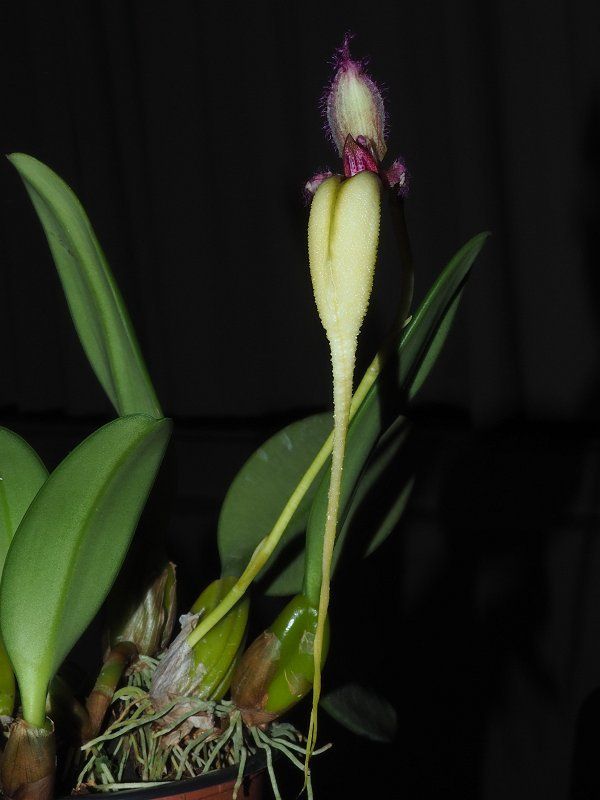 This species is a hot to warm grower and I have potted them in wood slat baskets with some tree fern. Give it shade, moist conditions, and plenty of air movement. The trick is to let the newest growth be close to the wood basket and the oldest in the center. This way the new growth attaches to the wood and is more likely to bloom.