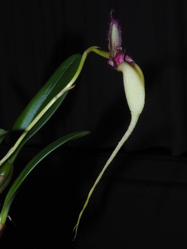 Found in peninsular Malaysia, Sumatra, Borneo and the Philippines in primary montane forests at elevations of sealevel to 1000 meters as a small sized, hot to warm growing epiphyte with 3/4 " to 1.2" [2 to 3 cm] between each ovoid to elliptic, olive green, obtusely 4 angled pseudobulb carrying a single, apical oblong-elliptic, petiolate base leaf that blooms in the summer and fall on a basal, suberect to patent, peduncle 1.6 to 2" [4 to 5 cm] long, 6.8 to 7.6 " [17 to 19 cm] long overall, single flowered inflorescence with a membraneous, lanceolate floral bract.