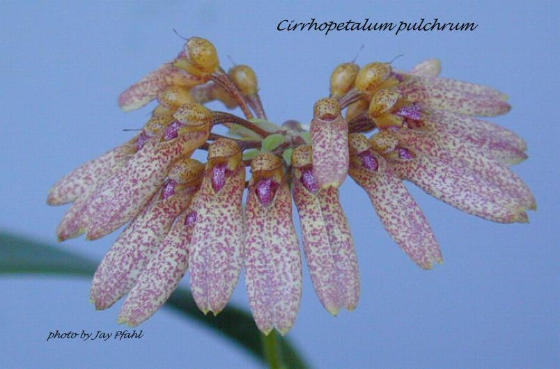 References W3 Tropicos, Kew Monocot list , IPNI ; Notes on Cirrhopetalum Seidenfadden 1973 drawing ok; AOS Bulletin Vol 52 No 4 1983 photo ok; Manual Of Orchids Stewart 1995; Orchids Of India II Biodiversity & Status of Bulbophyllum Thou Augustine & Kumar 2001 as Cirrhopetalum pulchrum; Bulbophyllum and Their Allies Seigerist 2001 as Cirrhopetalum pulchrum photo fide;Orchids of Sumatra Comber 2001; The Orchids of Bhutan Pearce & Cribb 2002; Lindleyana Vol 17 No 1 2002 as Bulbophyllum pulchrum; Orchids of India A Glimpse Misra 2007 as Cirrhopetalum pulchrum; Bulbophyllum: the incomplete Guide From A to why? Bill Thoms 2009 as B elatumphoto fide;