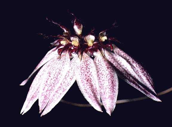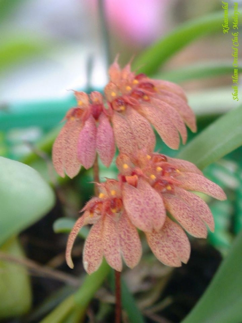 Found in Thailand, penninsular Malaysia and Borneo in tall, low and open forests at elevations of sea level to 100 meters as a miniature to small sized, hot growing epiphyte with .12 to 1" [.3 to 2.5 cm] between each distinct, ovoid to ellipsoid, hardly angular to obtusely 4 to 5 angled pseudobulbs carrying a single, apical, erect, ovate, obovate to elliptic, obtuse, petiolate base leaf that blooms on an obliquely erect to patent, peduncle with about 4 scales, 1.8 to 2.6" [4.5 to 6.5 cm] long, rachis porrect, .04 to .08" [1 to 2 mm] long, sumbumbellate, racemose, 5 to 10 flowered inflorescence.