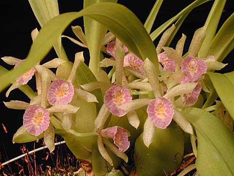 Found from Costa Rica to Colombia as a small sized, warm to cool growing epiphyte with oblong-elliptic, strongly compressed, sharply two angled pseudobulbs enveloped basally by foliaceous bracts and carrying a single, apical, linear, conduplicate, acuminate leaf that blooms in the spring and fall on axillary, racemose, 2 3/4" [7 cm] long inflorescence with inconspicuous floral bracts and carrying one to 4, fragrant flowers.