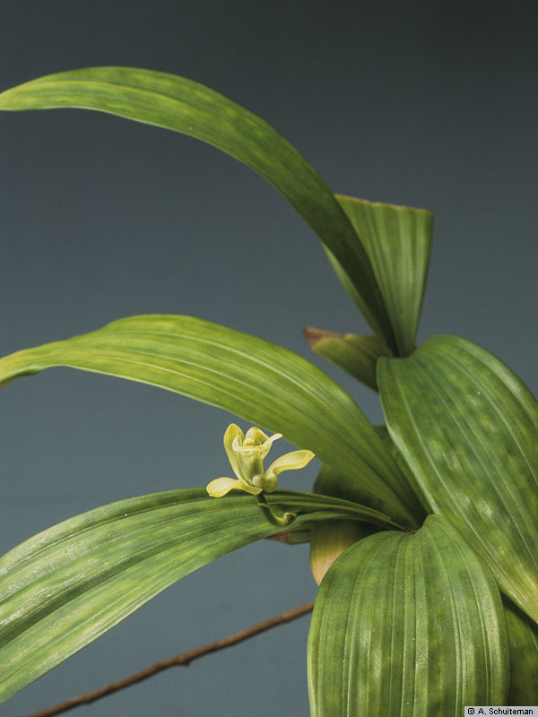 Found in Thailand, penninsular Malaysia, Borneo, Sumatra and Sulawesi in primary hill forests on sandstone at elevations of sea level to 800 meters as a small to just medium sized, hot to warm growing, light loving terrestrial in poor soils within open forests where sunlight reaches the forest floor or lithophyte, with a long, creeping rhizome with 1" [2.5 cm] between each internode giving rise to stems carrying 5, lanceolate, acuminate, plicate, basally clasping leaves that blooms spring and early summer on a terminal, terete, erect, branching, to 11" [27.5 cm] long, successively 1 to 2, many flowered inflorescence arising from the axils of the bracts.