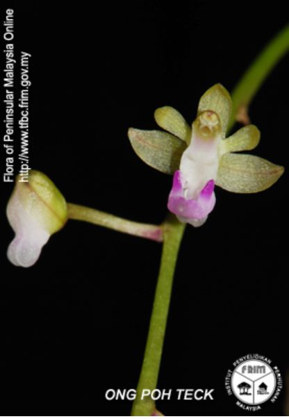 Found in Guangdong, Guangxi, Guizhou, Yunnan and Hainan provinces of China, Hong Kong, Assam India, eastern Himalayas, Bhutan, Andaman Islands, Myanmar, Thailand, Malaysia, Vietnam, Borneo, Java and Sumatra on dry rock faces in broad-leafed forests and hot dry valleys at elevations of 1100 to 2000 meters as a medium sized, cool growing epiphytic species with a short to long, stout to slender, erect to pendulous, thick, fleshy, distichous, terete, acute leaves that blooms in the summer and early fall on an axillary, 10 to 12" [25 to 30 cm] long, pendant, racemose to paniculate, to 3 branched, several flowered inflorescence that has successive opening flowers occuring .