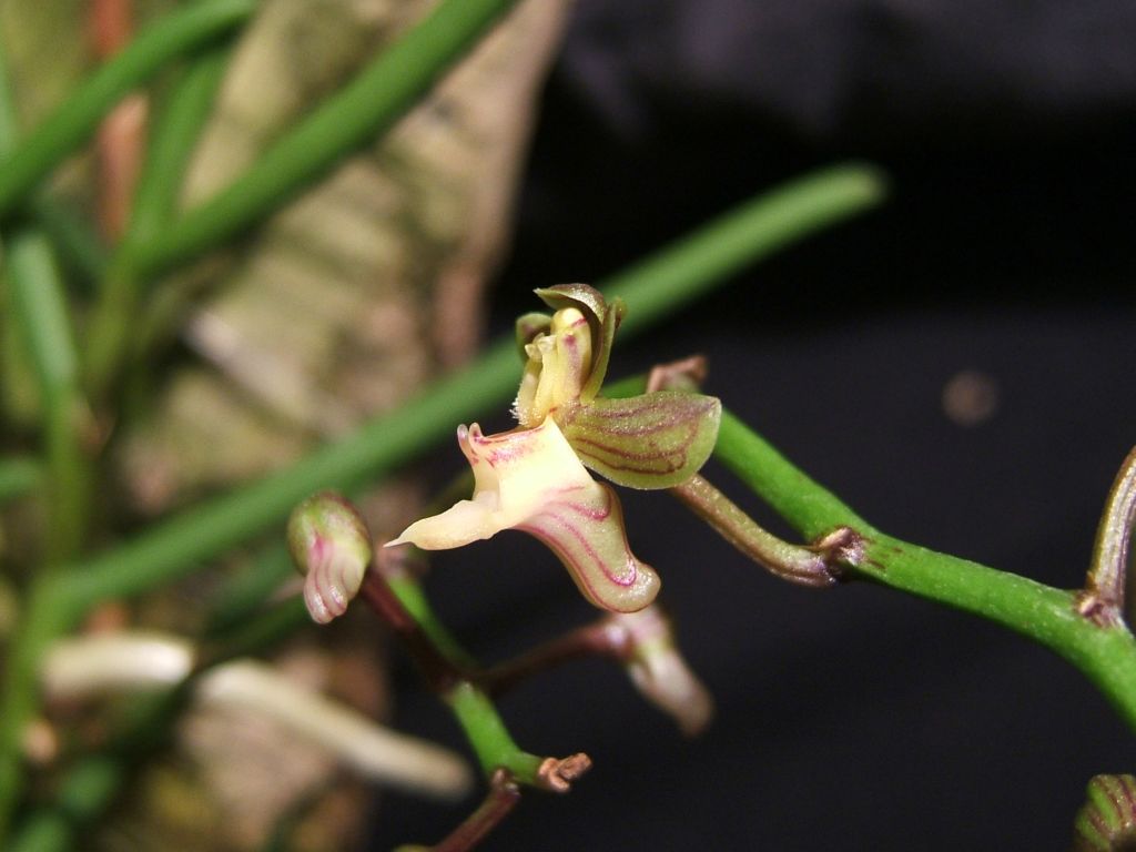 Found in Thailand and Vietnam as an erect, miniature sized, terete leafed, hot to warm growing epiphyte with basally branching, erect stems carrying many terete leaves that blooms in the fall on an axillary, paniculate, 2 to 3 branched, 16" [40 cm] long, 5 per branch at a time, successively several flowered inflorescence.