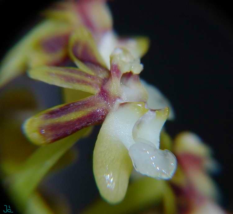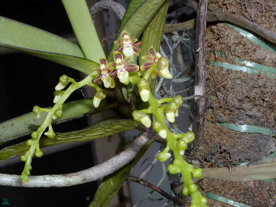 Found in Yunnan province of China, Thailand, Laos, Vietnam, Java, Sumatra, and Borneo on trees in montane forests at elevations around 400 to 2000 meters as a medium sized, hot to cool growing epiphyte with an elongate, slender stem carrying 2 rows of oblong to strap shaped, apically obtuse and unequally bilobed leaves that blooms in the spring on a horizontal to pendulous, 1 to 3 branched, 8" [20 cm] long, green, streaked purple, successively to 15 per branch many flowered inflorescence.