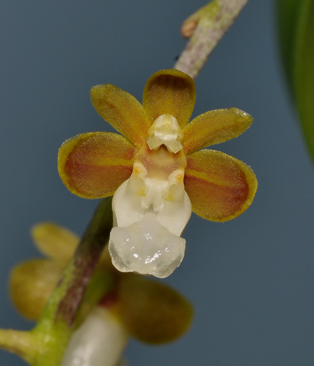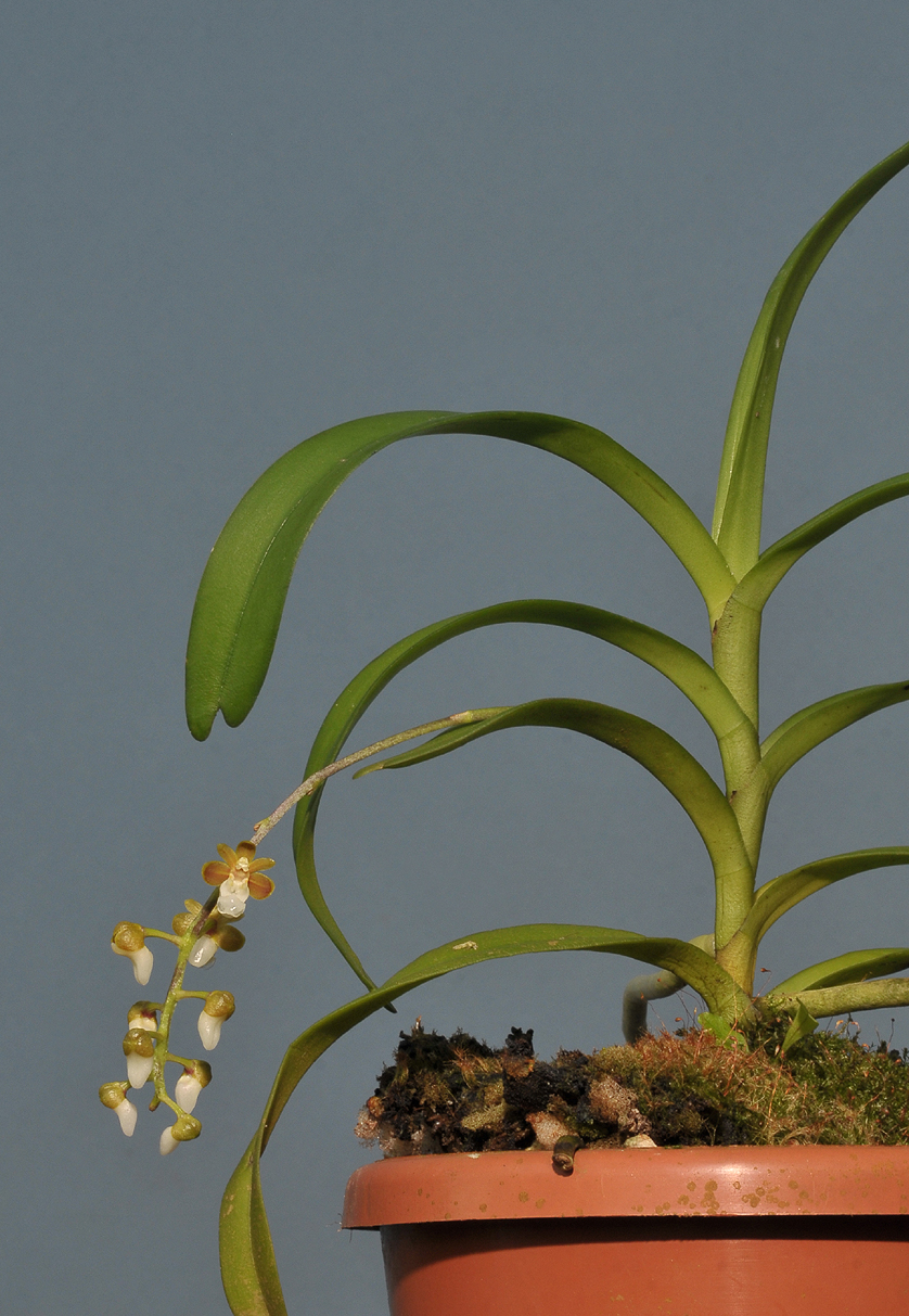Found in Borneo in hill forests at elevations around 300 to 600 meters as a medium sized, hot to warm growing epiphyte with a mostly unbranched stem carrying spreading, strap-shaped, unequally bilobed apically leaves that blooms in the spring on an axillary, stiffly horizontal then arching to pendent, paniculate, to 5 branched, each branch to 6" [15 cm] long, peduncle to 6" [15 cm] long, dull green with brown or maroon marks to 16" [40 cm] long, successively 25, 130 flowered inflorescence .