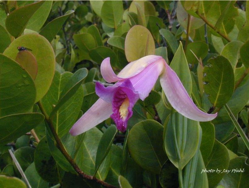 Found in coastal Sao Paulo Brazil near the beach as a large sized, warm growing terrestrial with an erect, elongate stem carrying erect-patent, glaucous, grey green, somewhat coriaceous, ovate-lanceolate, acuminate, amplexicaul below into the base leaves that blooms in the fall and winter on terminal, single flowered inflorescence carrying fragrant flowers.