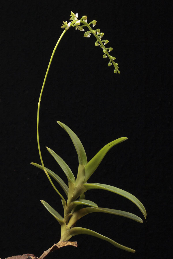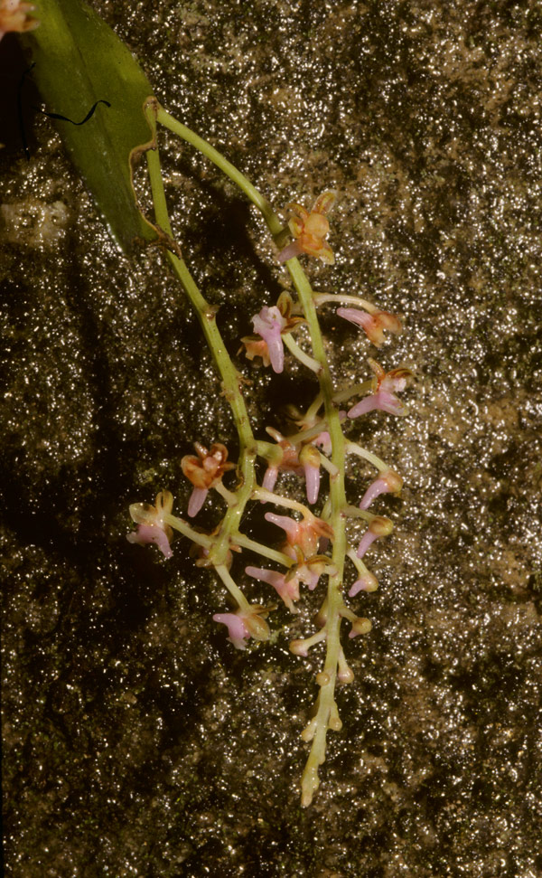Found in New Guinea in wet peaty glades at elevations around 3000 meters as a medium sized, cold growing terrestrial with stout, glabrous stems carrying towards the apex densely, many, patent, fleshy, glabrous, oblong-ovate, obliquely bilobed apically, obtuse, broadly truncate and subamplexicaulous basally leaves that blooms in the spring on an axillary, glabrous, patent to spreading, terete, ribbed, usually flexuous, 4 to 6" [10 to 15 cm] long, 15 to 30 flowered inflorescence with 1 to 2 basal bracts and 1 to 2 bracts higgher up and carrying glabrous, ovate-triangular, boat-shaped, obtuse, 1 nerved floral bracts.
