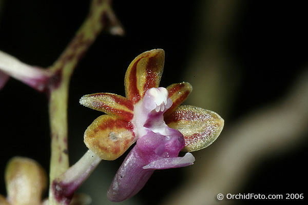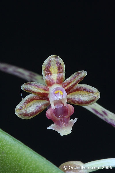 Found in the Chinese Himalayas, Assam, the eastern Himalayas, Bhutan, Sikkim, Thailand, Malaysia and Vietnam in broad leaved evergreen forests on tree trunks in shade at elevations of 500 to 2000 meters as a small sized, warm to cool growing epiphyte with a stem enveloped by leaf bearing sheaths and carrying distichous, unequally bilobed apically, linear, becoming conduplicate below into the base leaves that blooms in the spring through summer on a lateral, 5.6" to 8" [14 to 20 cm] long, paniculate, glabrous, laxly many flowered inflorescence with 3 distant, tubular bracts and ovate acute floral bracts.