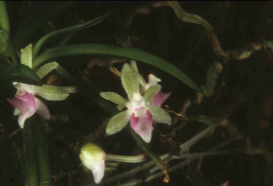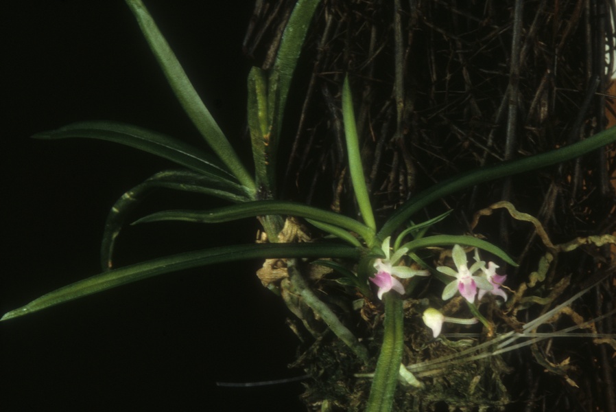Found in southeastern and southern Yunnan China on tree trunks along forest margins at elevations of 700 to 1200 meters as a miniature sized, warm to cold growing epiphyte with an erect, unbranched stem carrying 5 to 6, distichous, subbasal, flat, linear or narrowly oblong, fleshy, acute, basal half condulicate base leaves that blooms in the summer and earlier fall on a from near the base of the stem pendulous, longer than the leaves, 4 to 6" [10 to 15 cm] long, branched or not, laxly many flowered inflorescence with ovate-triangular, acute floral bracts.