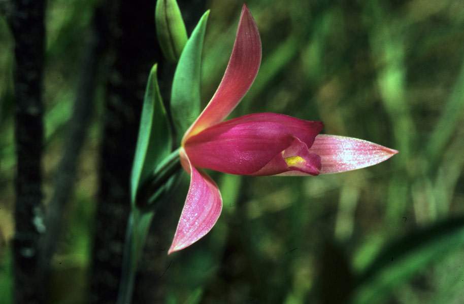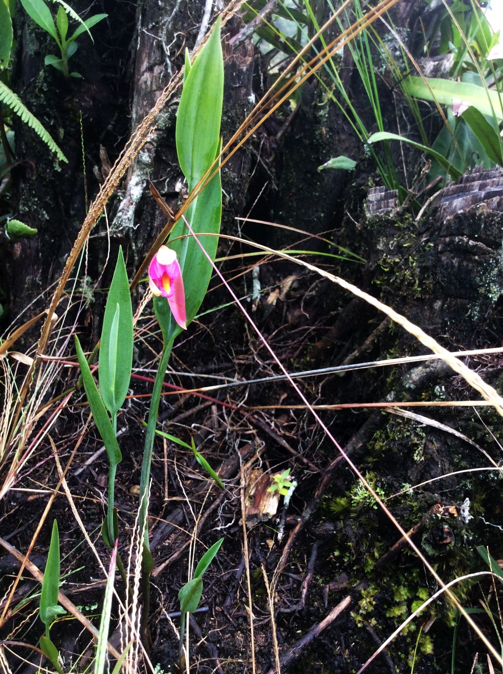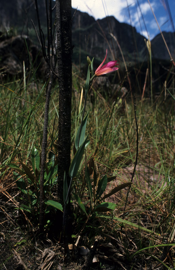 Found in Venezuela, Guyana and Ecuador in damp grassy soils of tepui at elevations around 1800 to 1900 meters as a small sized, cool growing terrestrial with an erect, green, glabrous, pubescent below ground level stem carrying to 6, soft, fleshy, linear, acute, basally clasping leaves that blooms in the winter on an erect, terminal, 1 to 2 flowered inflorescence.