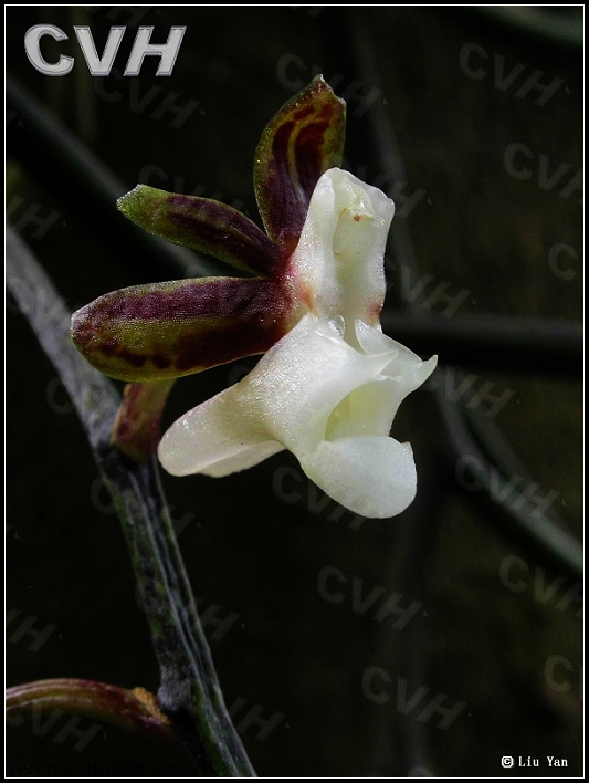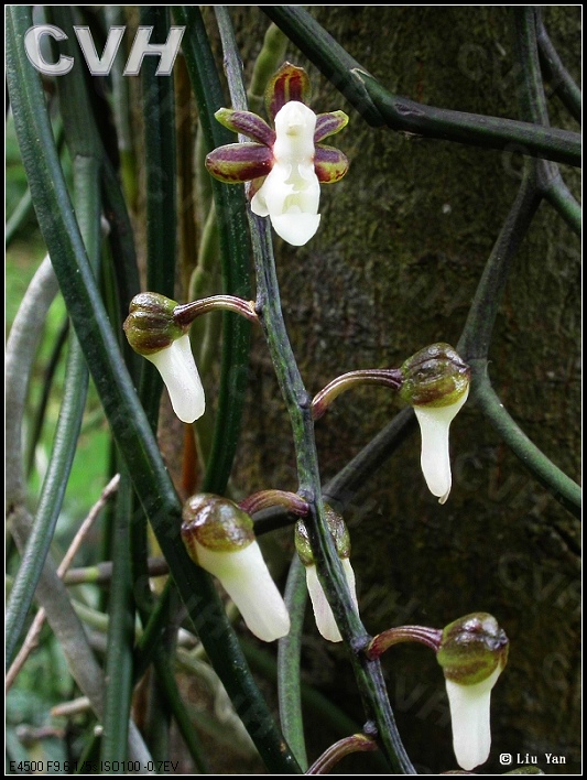 Found in southern Yunnan province of China in broadleaved evergreen forests on tree trunks at elevations around 1700 meters as a medium sized, cool growing epiphyte with pendulous, slender, branched or not stems carrying many semi-terete, slender, channeled adaxially, fleshy, acuminate leaves that blooms in the late spring on a lateral, usually unbranched, slender, 4" [10 cm] long, many flowered inflorescence with membraneous, ovate, obtuse floral bracts and carrying fleshy wide open flowers