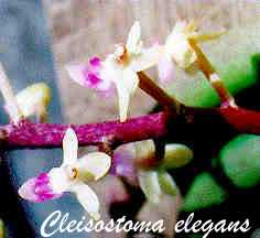 SUBFAMILY Epidendroideae, TRIBE Vandeae, SUBTRIBE Sarcanthinae. One of the largest mini flowered genera of it's subtribe it is widely distributed over the entire tropical Asia and out to the Philippines and south to Australia. This genus is composed of compact small to medium epiphytes that have flat fleshy leaves or terete leaves. The inflorescence can be short or long, simple or branched, erect or pendulous and always multiflowered. The 3-lobed lip is spurred nand has a sort of a foot that is attached to the margins of the side lobes and the short column with a short foot has 4 pollina that are united in 2 round bodies. The genus was established by C. L. Blume in 1825 using Cleisostoma sagittatum as the type species.