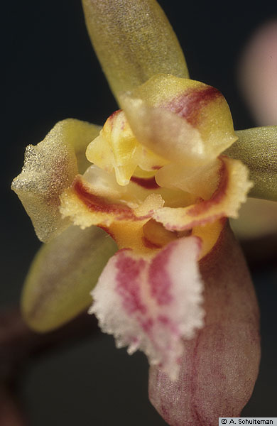 Found in India, Sikkim, Bhutan, penninsular Malaysia, Sumatra, Java, Borneo, Thailand, Cambodia, and Vietnam in primary lowland montane forests often near streams at elevations of 350 to 1500 meters as a miniature sized, hot to cool growing epiphyte with an ascending stem carrying several, dark green veined, linear, curved, with an erose bilobed apice, conduplicate below leaves that blooms in the late winter and early spring on an axillary, pendant, 9" to 24" [22.5 to 60 cm] long, occasionally branching inflorescence with a slightly fractiflex rachis with ovate, acute floral bracts and carrying several to many [20], successively opening flowers.