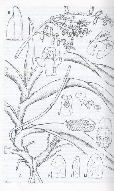 Found in New Caledonia and Vanuatu at elevations around 350 meters as a miniature to small sized, hot growing epiphyte with an erect to pendent-arcuate, leafy stem enveloped by leaf bearing sheaths carrying distichous, spreading, coriaceous, linear, unequally roundly bilobed apically leaves that blooms on an axillary, paniculate to rarely unbranched, peduncle terete, [17 to 25 cm] long, branches 1 to 2.8" [2.5 to 7 cm] long, many flowered inflorescence with triangular, spreading to reflexed floral bracts and carrying small flowers with whitish, pale green or yellow tepals and a white lip.