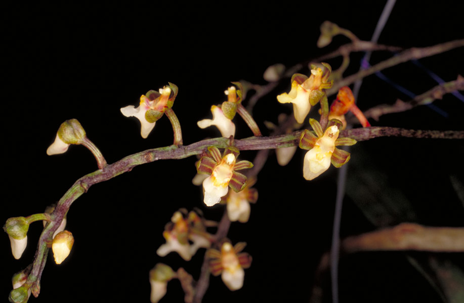 Found in Malaysia, Sumatra and Borneo at elevations around 208 meters as a miniature to small sized, hot growing epiphyte with an erect stem carrying strap-shaped, flaccid but fleshy, broadly rounded bilobed apically leaves that bloom on an axillary, occasionally shortly branching, to 6" [15 cm] long, to 20 flowered inflorescence