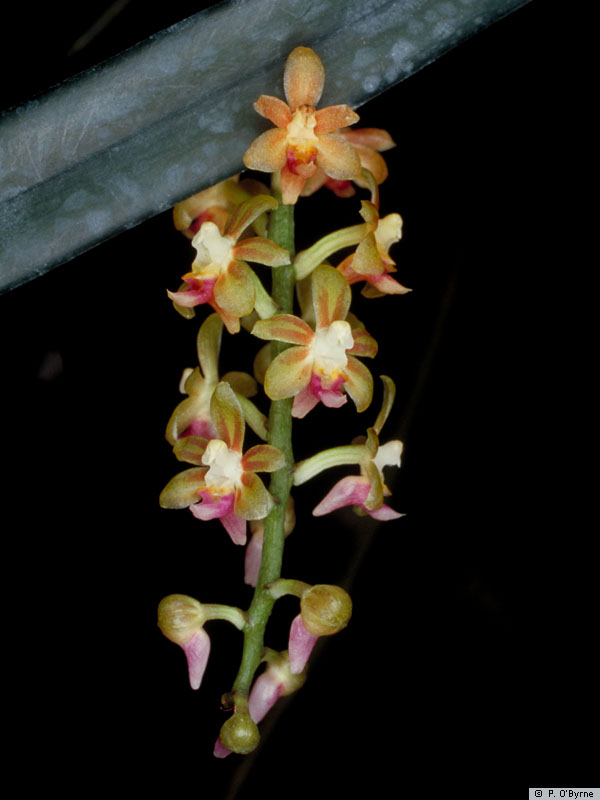 Found in Guangdong, Guangxi, Guizhou, Hainan and Yunnan provinces of China, Hong Kong, Thailand, Cambodia, Laos, and Vietnam in shady places and rocky cliffs in primary and secondary, evergreen, broadleafed coniferous and deciduous forests at elevations of 300 to 650 meters as a medium sized, hot to warm growing epiphtye or lithophyte with a suberect, sometimes branching stem carrying many, narrowly lanceolate, coriaceous, shortly caudate apically leaves that blooms in the summer on an axillary, from the upper nodes of the stem, pendant, loosely many flowered that blooms in the summer on an axillary, pendant, from the upper nodes of the stem, 9" [22.5 cm] long, many [35 to 45] flowered infloresence.
