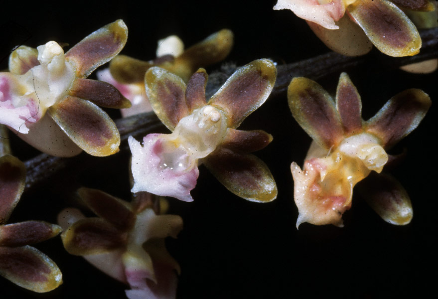 Found in Borneo, Java, Malaysia?, the Philippines and Sumatra on mangroves and lower montane forests at elevations of 600 to 1700 meters as a small sized, warm to cool growing epiphyte with very short, somtimes branched stems carrying several, v-channeled when young, unequally bilobed apically leaves that blooms in the spring on a dark, terete, 1 to 2 branched, to 18" [45 cm] long, many flowered inflorescence with triangular, acute floral bracts