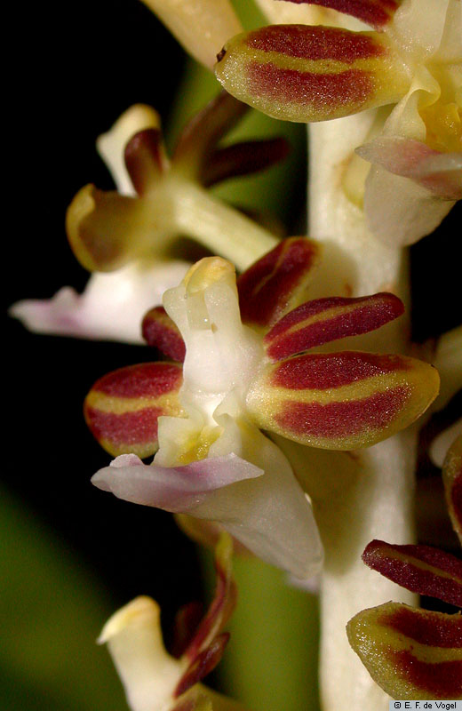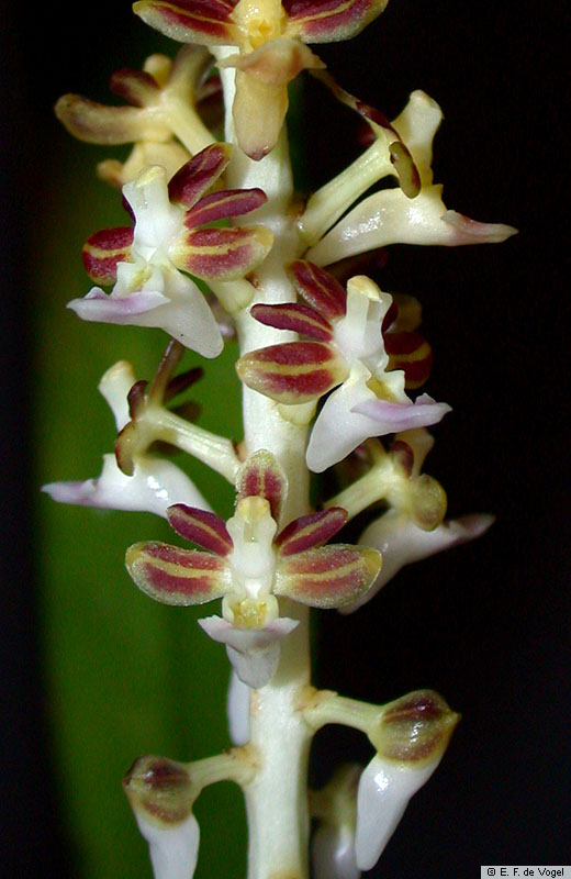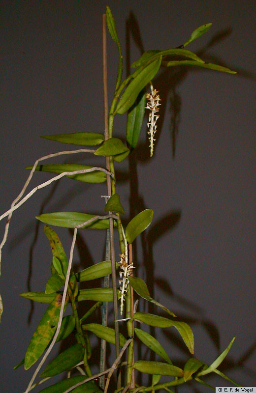 Found in Thailand, Laos, Vietnam, Malaysia, Borneo, Java and Sumatra in lowland, podosol and peat swamp forests at elevations of sealevel to 600 meters as a small to medium sized, hot to warm growing epiphyte with a stout, pendulous, apically upturned, elongate inflorescence carrying lanceolate, abruptly narrrowing near the apex, keeled below, slightly unequal apically, basally clasping leaves that blooms in the spring summer and fall on a simple to branched, pointed straight down, rigid, gradually lengthening to 16" [40 cm] long, many flowered inflorescence