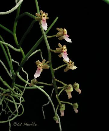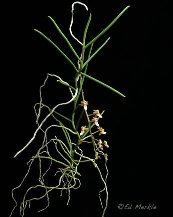 Found from Assam, eastern Himalayas, Nepal, Sikkim, Bhutan, Thailand, Laos, Fujian, Guangdong, Hainan and Yunnan provinces of China, Hong Kong and Vietnam in tropical and subtropical forests at elevations of 100 to 1100 meters as an erect, terete leafed, small sized, hot to warm growing monopodial epiphyte with an erect stem enveloped completely by imbricating, leaf bearing sheaths and carrying terete, fleshy, linear, subacute to obtuse, sessile, jointed leaves that blooms at any time but most often in the fall and winter on an axillary, arching then pendulous, slender, 4 to 11.2" [10 to 28 cm] long, simple to paniculate, several [11 to 20] flowered inflorescence with basal and then iserted at intervals, tubular, cylindric, ovate, triangular apically sheaths and lanceolate, subacute floral bracts and carrying small, long-lasting flowers.