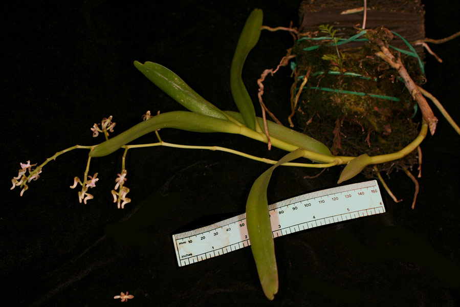Found in the Molucca Islands in montane forests at elevations of 900 to 1550 meters as a miniature to small sized, warm to cool growing epiphyte or on limestone boulders as a lithophyte with a spreading, slightly compressed stem carrying horizontally spreading, strap-shaped, unequally bilobed apically, rounded lobes, basally clasping leaves that blooms in the later winter and early spring on a lateral, opposite the leaf in mid stem, horizontally spreading, to 14" [35 cm] long, paniculate, 4 to 7 branched, often with secondary branches, with the main branch being 2 to 4" [5 to 10 cm] long, with up to successively 2 to 5, 30 flowered inflorescence.