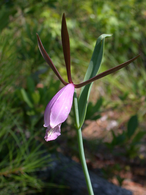 Found in the southeastern United States from New Jersy to Florida with eastern Kentucky and Tennesee to the west in pine barrens, bogs, savannahs, swamps, and damp meadows along streams at elevations of sea level to 1300 meters as a small to large sized, cold growing terrestrial with slender, green, purplish below, terete stem carrying a solitary, ascending, green, fleshy, glaucous, ovate to lanceolate leaf borne above the middle of the stem that blooms in the spring on a terminal, single flowered inflorescence with a leaflike, lanceolate, longer than the ovary floral bract and carrying a large, fragrant single flower