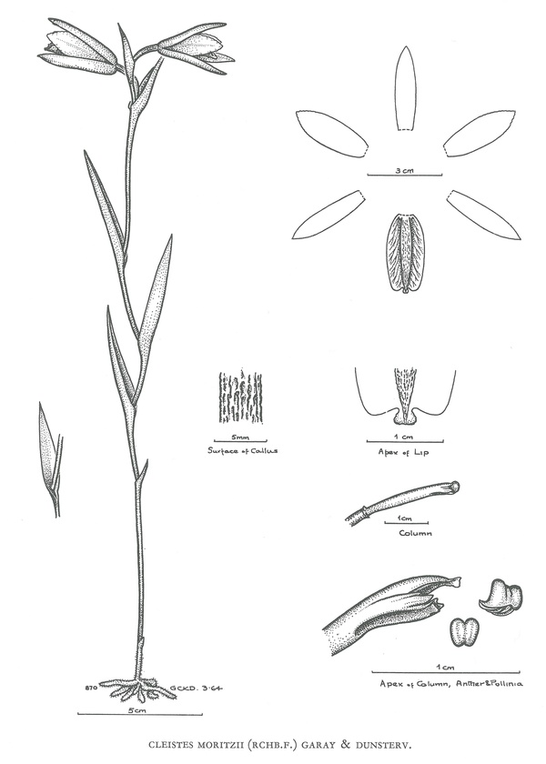 Cleistes triflora (C.Schweinf.) Carnevali & I.Ramírez 2000 Drawing of C moritzii by © Garay & Dunsterville and The Swiss Orchid Foundation at the Jany Renz Herbaria Website